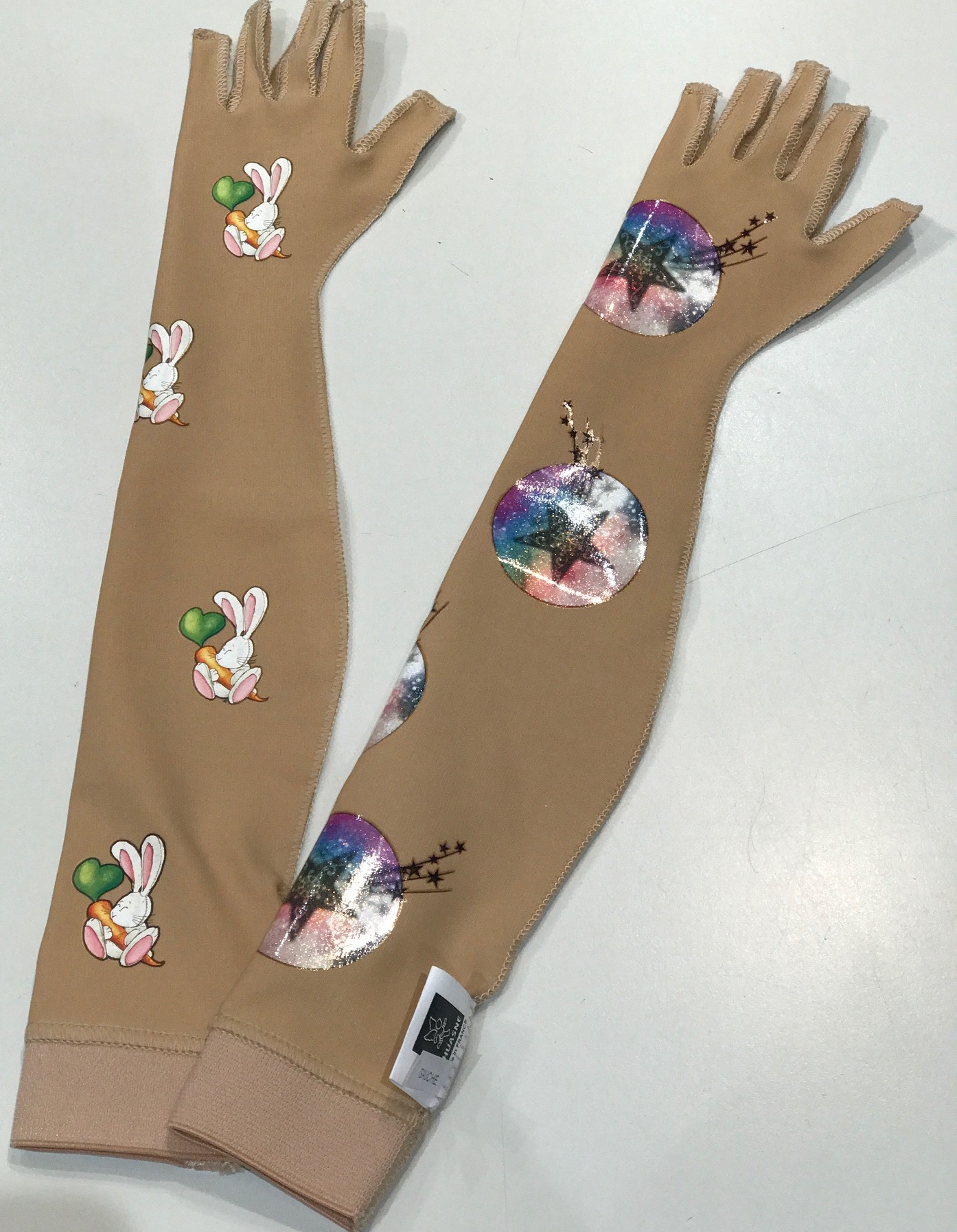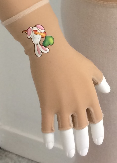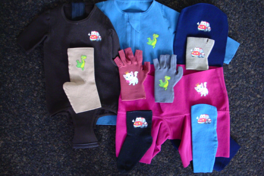 Nous pouvons ajouter des transferts avec des images ludiques, sur un gant ou un gilet par exemple, afin de permettre aux enfants ainsi qu'aux parents de mieux accepter ce nouveau vêtement qui doit être porté au quotidien.